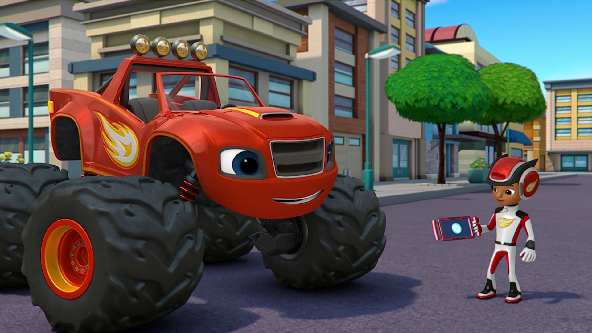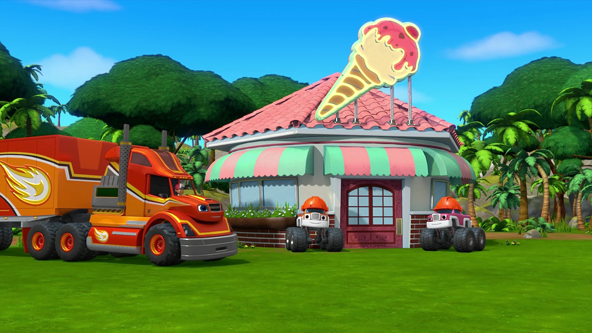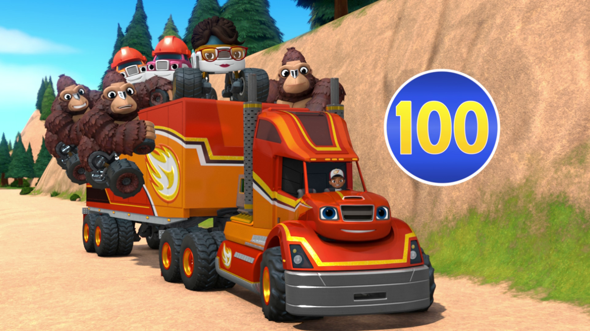 Big Rig to the Rescue! is the 1st episode in Season 6 of Blaze and the Monster Machines. Description[]Blaze and AJ are called upon to make three big deliveries all over Axle City, but they might need help to finish them in time. Meanwhile, Crusher and Pickle saw Big Rig Blaze. Crusher thinks he is stronger, so Pickle tossed him things but he ends up falling. Synopsis[] Blaze and AJ getting calls from Dr. Rashi, Construction Workers, and Firefighters. Blaze and AJ appear driving around Axle City as they greet the viewers. But when Blaze can finish, AJ tells him they get a call from Dr. Rashi that needs medicine to make for some sick trucks, Construction workers that need bricks, and Firefighters that need a hose to put out a forest fire. To do that all at once, Blaze transforms himself into a big rig like last time, as Big Rig Roll plays. Meanwhile, Crusher and Pickle appear to be apple picking, when Pickle sees Big Rig Blaze passing by them. Crusher thinks he's stronger than him, as he lifts a basket of apples. Pickle tries tossing apples at the basket, however, Tossing them causes Crusher to fall and get hit by the apples. The drawbridge raised up and won't go down. Big Rig Blaze is getting close to the doctor's office, But AJ notices a drawl-bridge that is stuck. To make the bridge go down, They use Mass as they get help from the viewers by choosing metal beams, and anchors, Thanks from Zeg and Starla. After the situation, He makes it to the doctor's office and brings Dr. Rashi the medicine as she gives everyone some as the STEM song plays. Meanwhile, Crusher and Pickle appear again, as they appear to be fishing. Pickle sees Big Rig Blaze again, Crusher still thinks he is the strongest, as he lifts a Tackle box, Pickle tosses a bucket, a chair, a basketball, and a bowl of spaghetti which it causes him to fall into the water. Sleeping gorillas blocking their way. Back to Blaze and AJ, they go inside a cave, But they suddenly saw sleeping gorillas blocking their way. AJ has an idea, they will honk the horns to wake them up, they get help from the viewers as they wake 4, 5, and 7 gorillas as they get pass the cave. Blaze helps the construction workers make an ice cream store. After passing the cave, They bring the bricks to the construction workers, As they built an ice cream store, all they need is to bring the hose to the Firefighters. Meanwhile, Crusher and Pickle are seen again, as they seem to be building a tightrope. Pickle once again, notices Big Rig Blaze again. But Crusher once again, still thinks he is the strongest. So Pickle tosses a shoe, weights, a chair, a bathtub, and a pizza. But it causes Crusher to fall down and get hit by the stuff, as Pickle eats a piece of pizza. Mass reaching to one-hundred. Big Rig Blaze is still driving to the firefighters, when they suddenly notice a rockslide blocking their way. Luckily, They get help from the viewers, as well as Help from Dr. Rashi, The Construction Workers, and the Gorillas, all the way to 100 strength. So long, Big Rig Blaze. After he bashes the rocks, He sees the smoke coming from the trees, But he uses Blazing Speed to put out the fire with the hose. Big Rig Blaze jumps over the fire and puts it out, Blaze has been on an amazing adventure, and everyone thanks him for his help as he drives away while Big Rig Roll plays, as the episode ends. Other links[]
