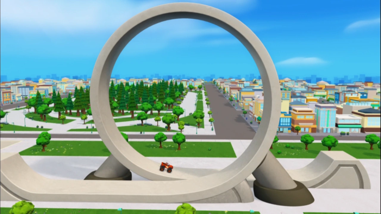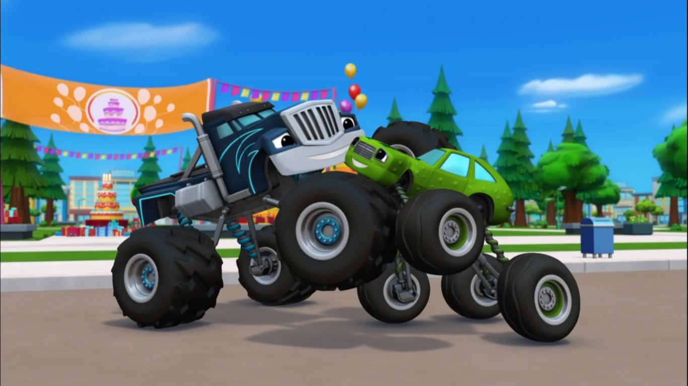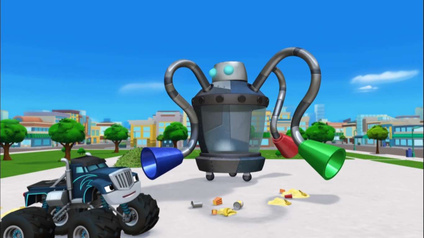 Pickle Power is the 20th and final episode in Season 2 of Blaze and the Monster Machines. Description[]When Crusher's attempt to clean up with his mechanical vacuum goes haywire and sucks up everything, including himself, Blaze and Pickle work together to find a way to turn it off and rescue him. Synopsis[] Blaze and AJ ride a giant loop-de-loop. Blaze and AJ are doing tricks at the park when he comes across a really big loop-de-loop, which is the biggest in the park, and while they loop, Blaze explains the situation to the viewers before looping out. After riding it, Crusher and Pickle appear and he invites them to try it. While Crusher is surprised at first, Pickle admits they never did a loop-de-loop that big before and remembers an old lesson - you never know what you can do until you try. Crusher develops Auto-Vac... Pickle rides the loop-de-loop perfectly, but when Crusher rides it with his eyes closed, he only goes halfway up before he slides back and crashes into some garbage. Blaze and Pickle come over and Pickle invites everyone to help clean up the mess. Crusher detests, thinking it will take forever to clean up with the brooms they were given, and decides to create a machine to do all the cleaning for them. ...who sucks up everything in sight. Using his chassis bag, he puts together a robotic vacuum cleaner called Auto-Vac and presses its three power buttons to turn it on. Auto-Vac starts sucking up all the trash as requested, but suddenly, it starts sucking up everything that isn't garbage, which shocks Crusher. He tries to stop Auto-Vac from disobeying him but accidentally gets himself sucked into Auto-Vac as well. Auto-Vac starts running amok downtown, and Blaze, AJ, and Pickle see Crusher stuck inside it. Pickle realizes Crusher needs help and someone has to turn off Auto-Vac and save him. Blaze decides to team up with him to do so, which surprises him, and they set off as the travel song is heard. Elasticity is today's STEM concept. As Auto-Vac starts sucking up more things, it eventually sucks up a sewer cap, leaving Blaze, AJ, and Pickle to fall into the hole below. Luckily, Blaze finds an old trampoline frame which they can use to bounce out, but they need something with enough elasticity so they can do so. Pickle finds some paper, but it just rips. AJ discovers a blanket, but it just stretches. Blaze, knowing what's perfect, finds a piece of rubber, which bounces right back when Pickle jumps on it. With such, they make it out of the hole. Blaze and Pickle are outnumbered by bulls. Upon seeing Auto-Vac escape, they chase after it as an elasticity song is heard. After that, Auto-Vac approaches a farm and sucks up more things, one in particular being a gate to a pen holding a herd of angry bulls. Because of that, they get out, and Pickle names one of them "Smashy" before they start chasing the two trucks everywhere. As the bulls chase Blaze, AJ, and Pickle, Blaze finds places to jump over with the viewer's help, and with that, some of the bulls cannot jump over. Eventually, only Smashy remains, so Blaze activates Blazing Speed and uses it on himself and Pickle to outrun him and lock the farm gate to stop him. Feeling remorseful, Pickle offers Smashy an apple to cheer him up. Using a slingshot to hit the off buttons. Blaze, AJ, and Pickle see Auto-Vac heading back to Axle City, and follow it there. Blaze realizes that to turn Auto-Vac off they need to press the three off buttons on its back, but they're really high up. AJ decides to use a slingshot with a lot of elasticity to launch something up to the buttons, and Blaze turns into one in return. Pickle also uses a jar of pickles to use for launching. With help from the viewers, Blaze manages to find the right trajectories to hit the buttons. Pickle does well with pressing the red and green buttons, but by the time the blue button is to be pressed, Auto-Vac is approaching a birthday party and Pickle is all out of Pickles. Luckily, Pickle decides to launch himself, and he successfully presses the button, deactivating Auto-Vac. Crusher thanks Pickle for rescuing him. Since Crusher is still stuck inside Auto-Vac, Blaze finds the reset switch and flips it, making Auto-Vac return everything it sucked up, including Crusher. Astounded that Pickle saved the day, Crusher thanks him. Then, he, Blaze, and AJ end the episode by all saying his moral that he mentioned throughout, surprising him in return. Other links[] |
