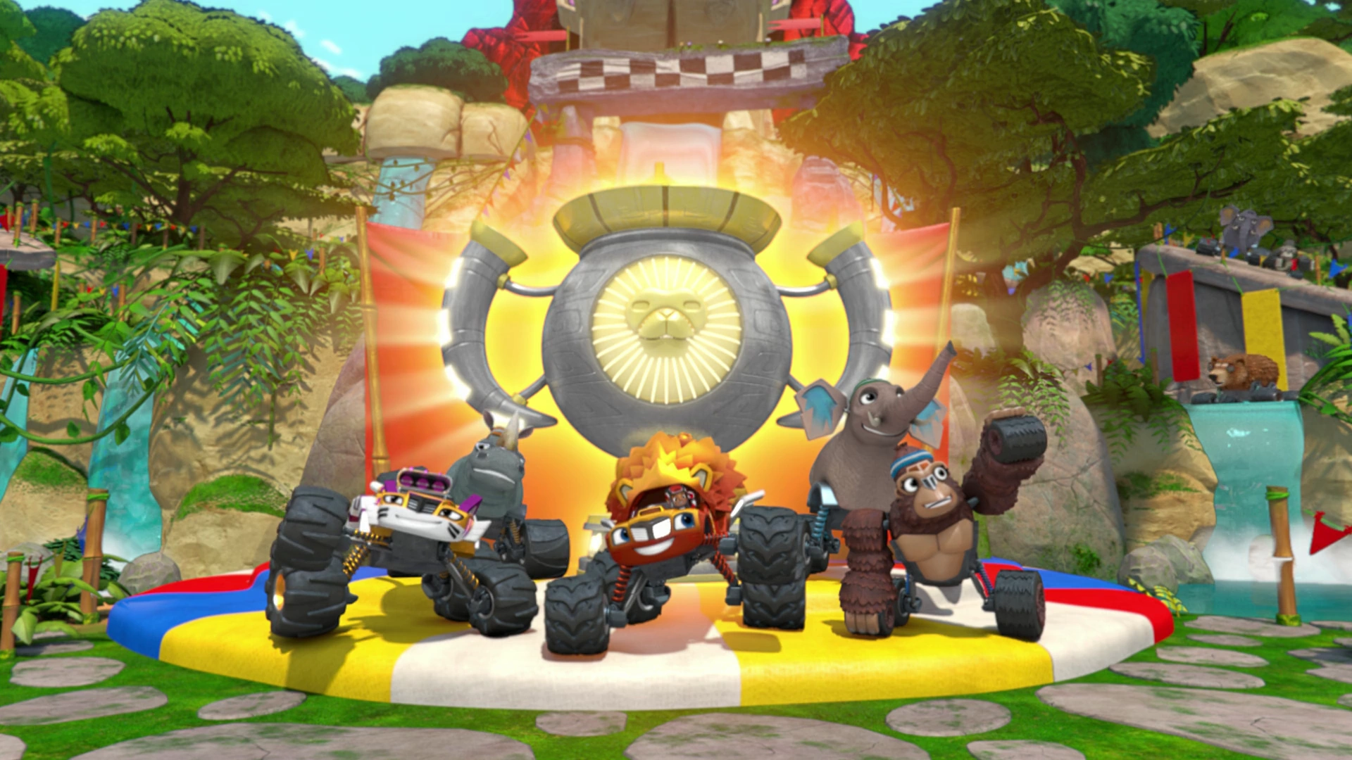 Ready, Set, Roar! is the 13th episode in Season 3 of Blaze and the Monster Machines, and the fifth Wild Wheels episode. Description[]Blaze and Stripes take part in a race around Animal Island while turning into ferocous big cats, but to win, they have to get past obstacles set up by Crusher dressed as a "cheating" cheetah. Synopsis[] Swoops drops Blaze and Stripes off at the Animal Island Championship... The episode begins with Swoops flying Blaze, AJ and Stripes to Animal Island. Blaze greets the viewers and they see a race about to occur. Burt Black N' White announces it's the Animal Island Championship, where the winners win the legendary animal trophy. Swoops takes them down and lets them off before leaving. ...and they end up participating as great cats. The animals arrive and greet Blaze and Stripes, who are excited to watch them race. To their surprise, they want them to be in the race with them which they happily accept. Since it's a race with animals, Blaze decides he should be an animal too, and knows the perfect one that's perfect for racing: a lion. He turns himself into one and Stripes into Super Tiger Stripes, and head for the start with their animal friends. Crusher is also participating as a "cheating" cheetah. Pickle is also watching the race, and sees Crusher arrive dressed as a cheetah, who is participating. Pickle thinks he's a cheetah because they're the fastest land animal, but Crusher claims he's one because he likes to cheat. He barges his way to the start, but is shocked to see Blaze participating as well. Burt gives the signal and the race begins, while the Wild Wheels song plays. Chompy eats the bridge, but that doesn't stop Blaze and Stripes from jumping. The first stop in the race is a treetop track, and once there, Crusher is determined not to let Blaze and Stripes win, so he constructs a chomping robot named Chompy, who eats up the racetrack and stops them from going on. Luckily, Blaze reminds Stripes they have lion and tiger jumping power, and use such to super jump over the eaten gap. Blaze continues to find Chompy with help from the viewers, and successfully pass Chompy and made him break. They reach the end of the treetops and go on while the Great Cats song is heard. Crusher enters a cave, where he spots Pickle dressed as a squid, who decided to pretend to be one hence the fact it's an animal race. After squirting some ink which slips Crusher up, he spots Bunk, Bam and Nelson coming his way and traps them in twisty tangler vines to stop them. Blaze also gets trapped as well. Blaze and Stripes also have protractile claws. Stripes, managing to avoid the vines, realizes he has protractile claws and uses them to cut the vine to pieces and free Blaze. Making their way through the cave, they find their animal friends also trapped, and with the viewer's help, they locate the vines they're trapped them and cut them. Once all are together, Blaze encourages everyone to not give up and they can still win. Blaze uses a great cat's roar to stop the lullaby machine. Crusher crosses a bridge, finding Pickle on the other side now dressed as an oxpecker bird, which eat bugs off animals to clean them which he demonstrates. When Crusher hears Stripes and the animals coming, he constructs a super sleepy lullaby machine to send them to sleep and stop. Blaze, avoiding the lullaby machine, cannot wake up his friends as the music is too loud. AJ says they need something louder, and Blaze knows just the thing: a great cat's roar. Blaze manages to roar loud enough with the viewer's help, and with that, his roar destroys the lullaby machine, waking up the others and they continue on. Blaze, Stripes and the animals are Animal Island champions. With the end of the race nigh, Blaze sees Crusher nearing the finish line before him and is far ahead, so Blaze infuses everyone with Blazing Speed. With that, they manage to overtake Crusher and cross the finish line first, winning the Animal Island Championship. Crusher is upset he lost, only to encounter Pickle now dressed as a snail and spreading slime everywhere. Crusher is disgusted, but he slips on the slime and Pickle gives him a hug in an attempt to cheer him up, ending the episode. Other links[] |