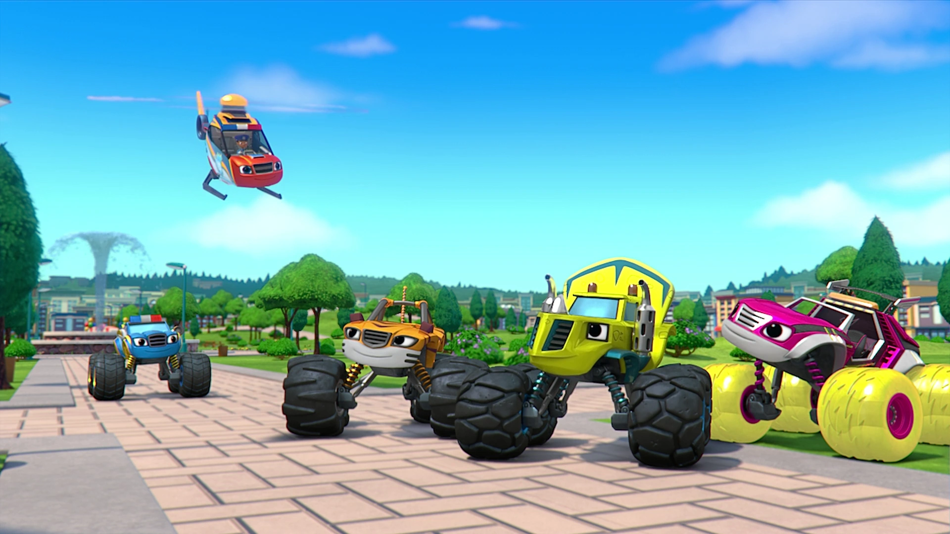 The police trio got to the park, when they notice their friends are flying away on balloons. So Blaze transforms into a helicopter to rescue them along with AJ. On the sky, They get help from the viewers to find their friends as he pulls down Stripes and Watts, but Zeg's balloons were popped as he was about to fall, So he pulls him down so they conform them to catch the Treat Thief as they drive.